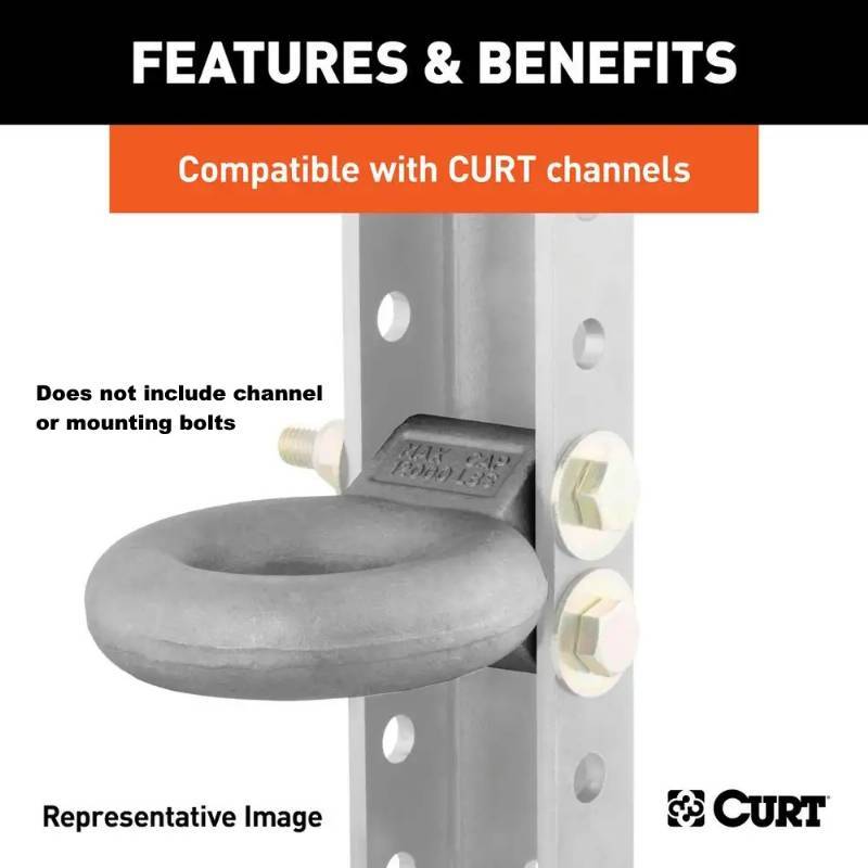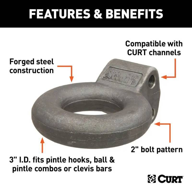 This lunette eye is designed to mount on standard 3" width channels allowing for easy height adjustment and trailer levelling. It features a forged steel construction and boasts a gross trailer weight capacity of 24000 lbs. With a 3" inside diameter this lunette ring fits a variety pintle hooks and ball and pintle combinations