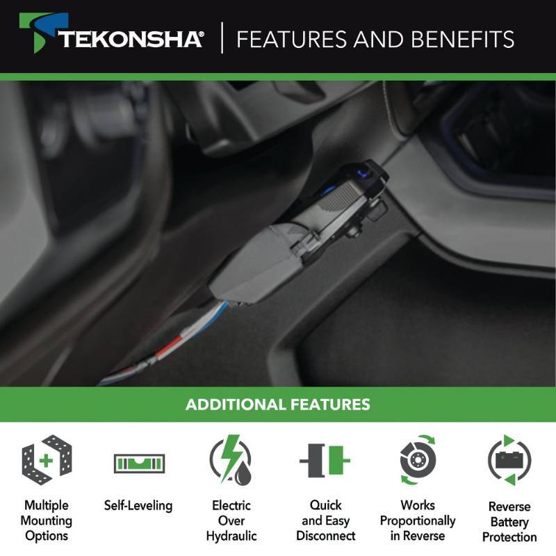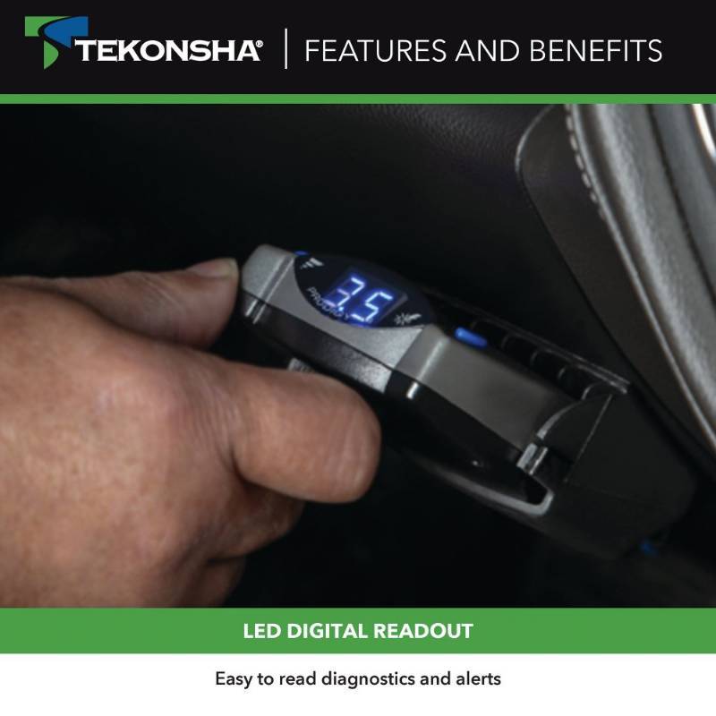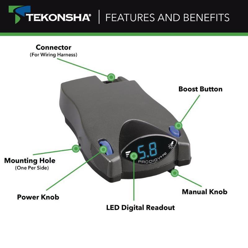The Prodigy P2 electric brake controller supplies power to your tow vehicle's brakes proportionally. This means that your trailer brakes at the same time and with the same strength as your vehicle - even in reverse gear. If you have to slam on your truck's brakes, the trailer's brakes respond instantly, too - there's no delay. Therefore your vehicle's brakes aren't overworked from trying to stop the entire load, and they suffer less wear and tear extending the longevity of your brakes compared to time based controls. The P2 also cuts power to the trailer's brakes when your vehicle is stopped - extending the life of the magnets and brake shoes in the trailer's brake assemblies. Aside from smoother, more efficient braking that results from proportional application of stopping power, the Prodigy P2 also has a boost feature that gives you more initial braking power for those times when you're towing heavier loads. That's when more braking power is needed to stop the trailer at the same time as the tow vehicle. The boost setting sends 13 or 25 percent more power (depending on which setting you choose) back to the trailer brakes, thus compensating for heavier loads. You can boost the power manually at the push of a button as well. The boost feature gets more power to the trailer brakes exactly when you need it most, and your fully loaded rig brakes smoothly and comfortably. This brake controller levels automatically as you drive, so there's no problem using it on steep hills or when towing through the mountains. The self-leveling feature also makes the Prodigy easy to install: Simply mount it in your cab at any vertical angle (it has 360-degree rotation). It's easy to see the display and to access the pivoting manual override lever on the bottom of the unit. The P2's continuous diagnostic check monitors your connection and magnet condition, so you can fix any problems before they land you on the side of the road. This newest version of Tekonsha's popular Prodigy brake controller has reverse battery protection to preserve the unit and accessory systems. And the power-save mode reduces battery drain when the controller isn't in use.