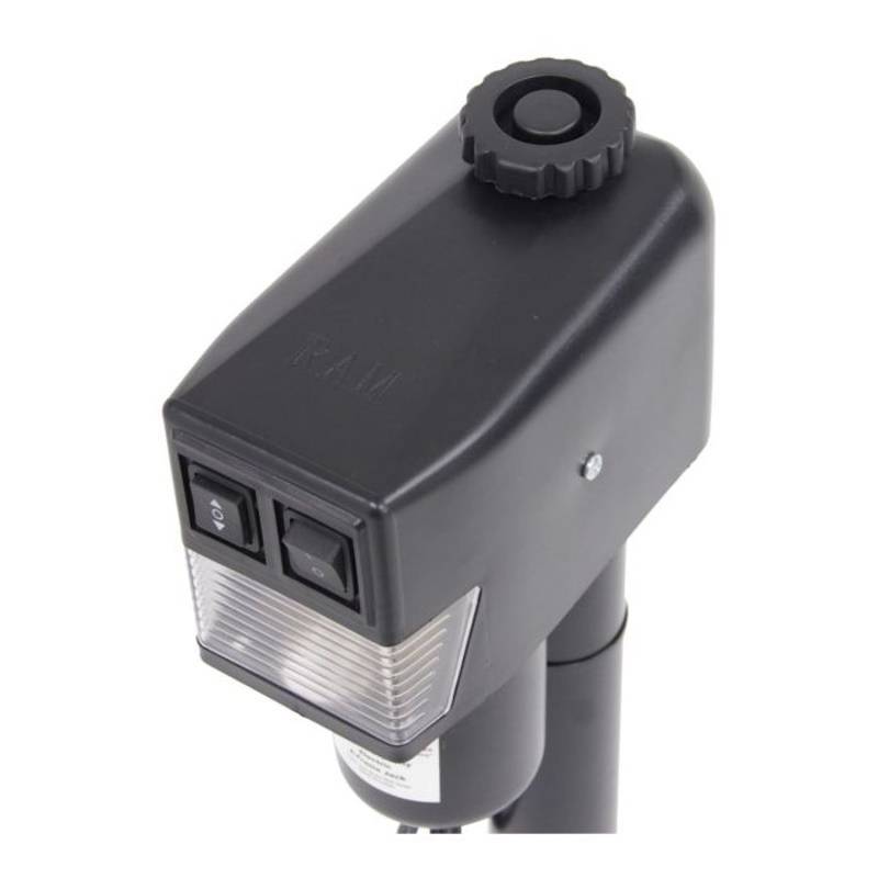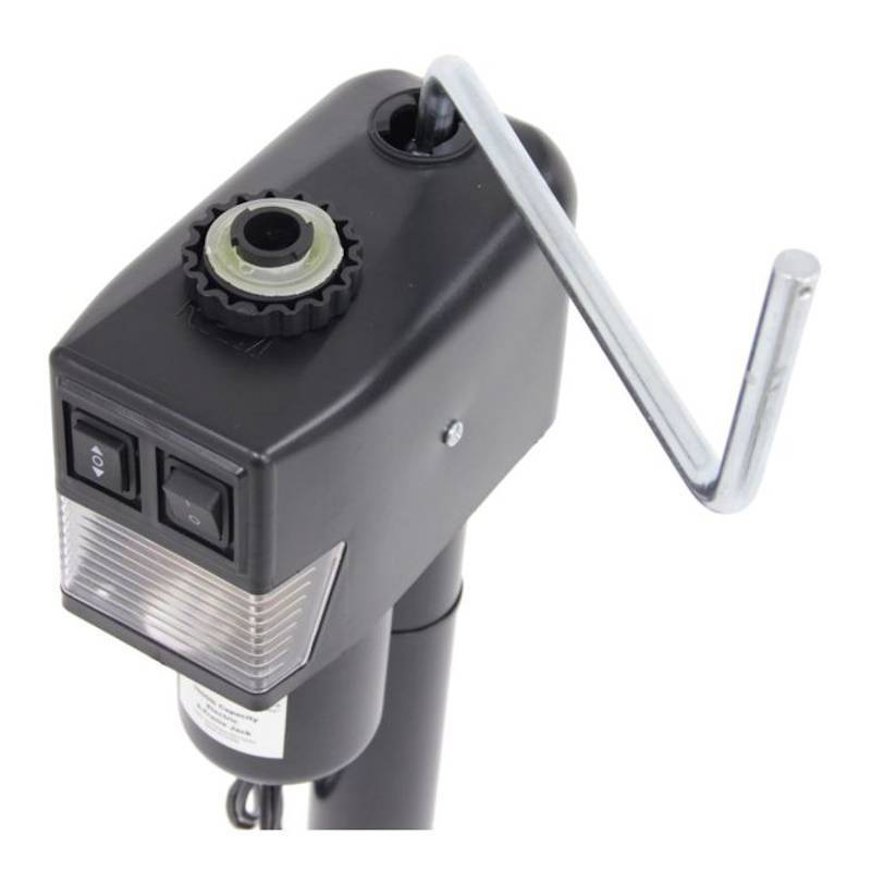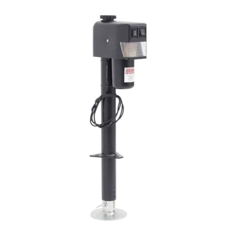 RAM 3500 lbs. capacity Black top cowling heavy duty electric trailer tongue jack used with trailers that have an a-frame coupler. Can be welded or bolted in place. Rated for 3500 lbs. lift capacity. Easy to operate with just a flip of the switch.