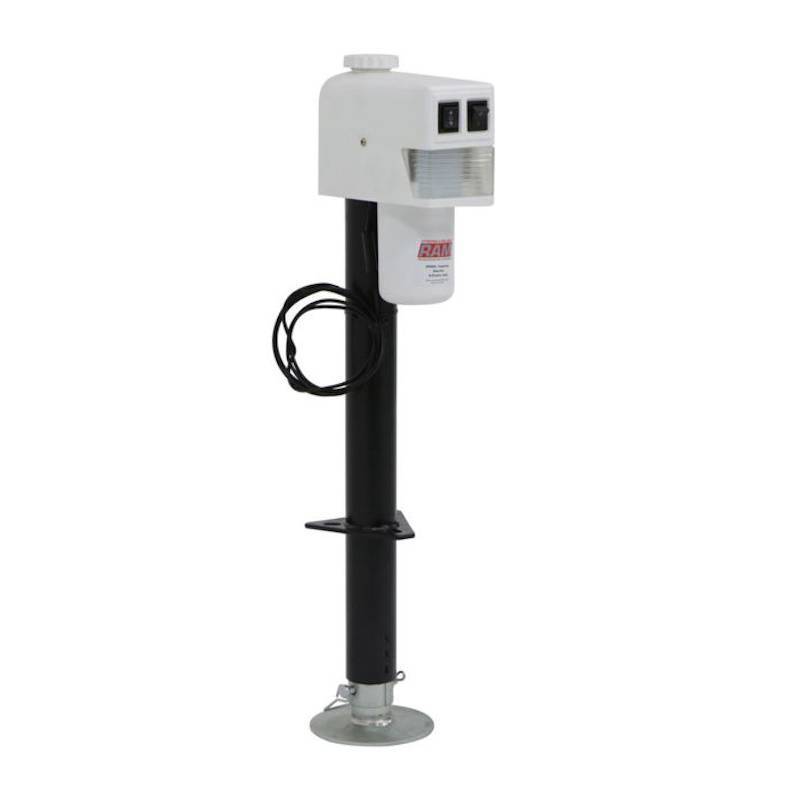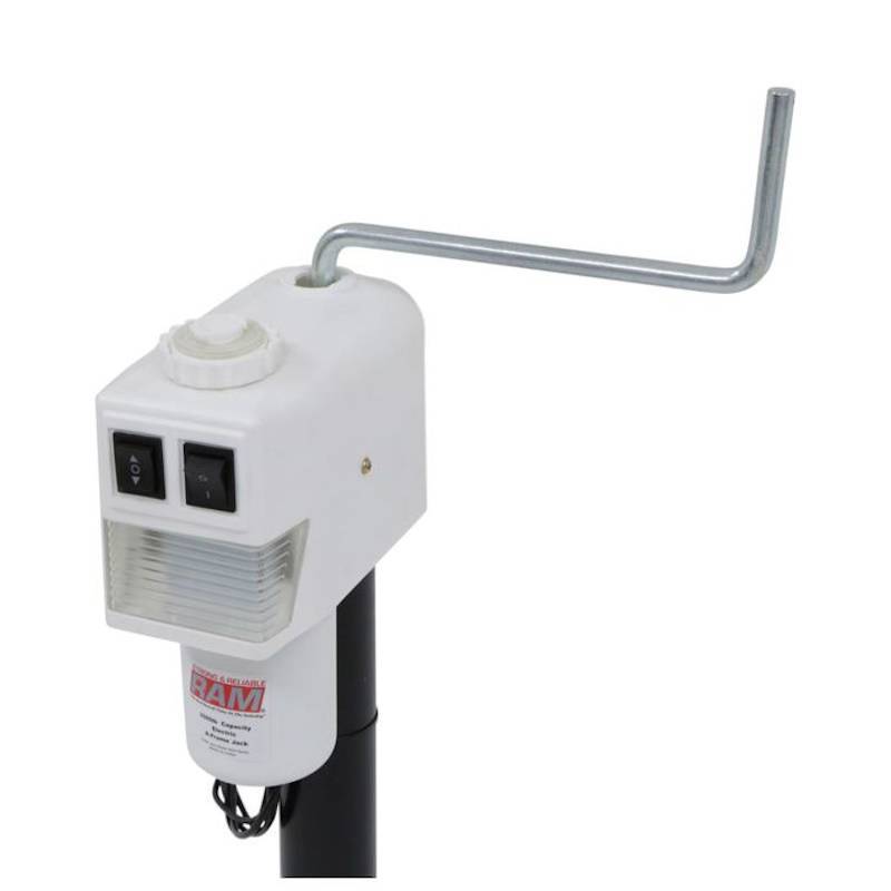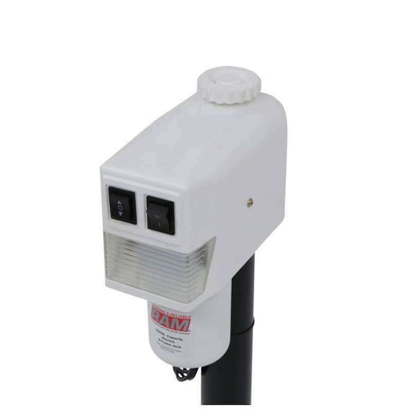 RAM 3500 lbs. capacity White top cowling heavy duty electric trailer tongue jack used with trailers that have an a-frame coupler. Can be welded or bolted in place. Rated for 3500 lbs. lift capacity. Easy to operate with just a flip of the switch.