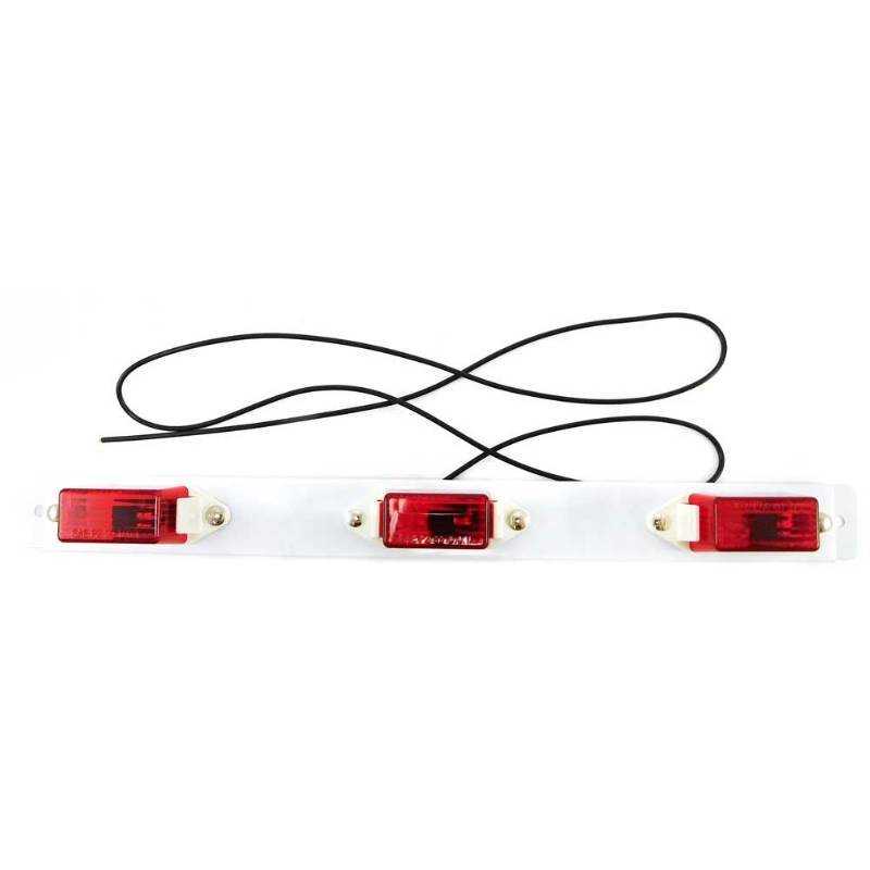 Red Identification Light Bar with White Steel Base with three MC-11 series lights on a white metal base. 50” lead wire. Mounts on 14-3/8” centers. Features easy to change replaceable bulbs. Single wire design grounds through trailer frame.